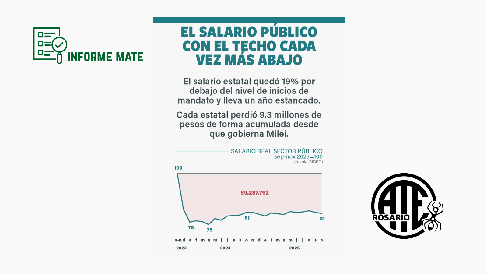 Frente a los contundentes datos difundidos por el MATE, la Secretaria General de ATE Rosario, Lorena Almirón, sostuvo: “exigimos inmediata recuperación salarial para cada estatal de nuestra provincia. A la pérdida que ronda los nueve millones de pesos desde que asumieron estos gobiernos, debemos sumar el congelamiento de las asignaciones familiares, la falta de titularizaciones, concursos e ingresos”.
