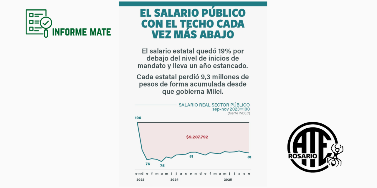 En un nuevo informe del Mirador de la Actualidad, el Trabajo y la Economía (MATE), se dio a conocer la pérdida de poder adquisitivo, transferencia de ingresos, inflación y caída recaudatoria por reducción impositiva a los sectores más ricos. El salario estatal quedó 19% por debajo del nivel de inicios de mandato y lleva un año estancado.