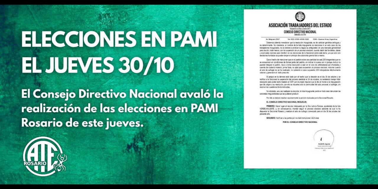 La Seccional Rosario de la Asociación Trabajadores del Estado informa que, tras una serie de impugnaciones y revocatorias de las mismas, el máximo órgano de definición de nuestra entidad sindical, que es el Consejo Directivo Nacional, avaló la realización de las elecciones en PAMI Rosario el 30 de octubre de 2025.