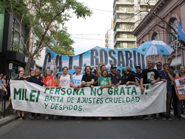 ATE Rosario y la CTAA local junto a diversas organizaciones se manifestaron en la previa al cierre de campaña de La Libertad Avanza. “En la ciudad la gente está enojada, es un agravio que Milei esté acá, encima con recursos del Estado”, dijo la dirigenta estatal y ctaísta, Lorena Almirón.