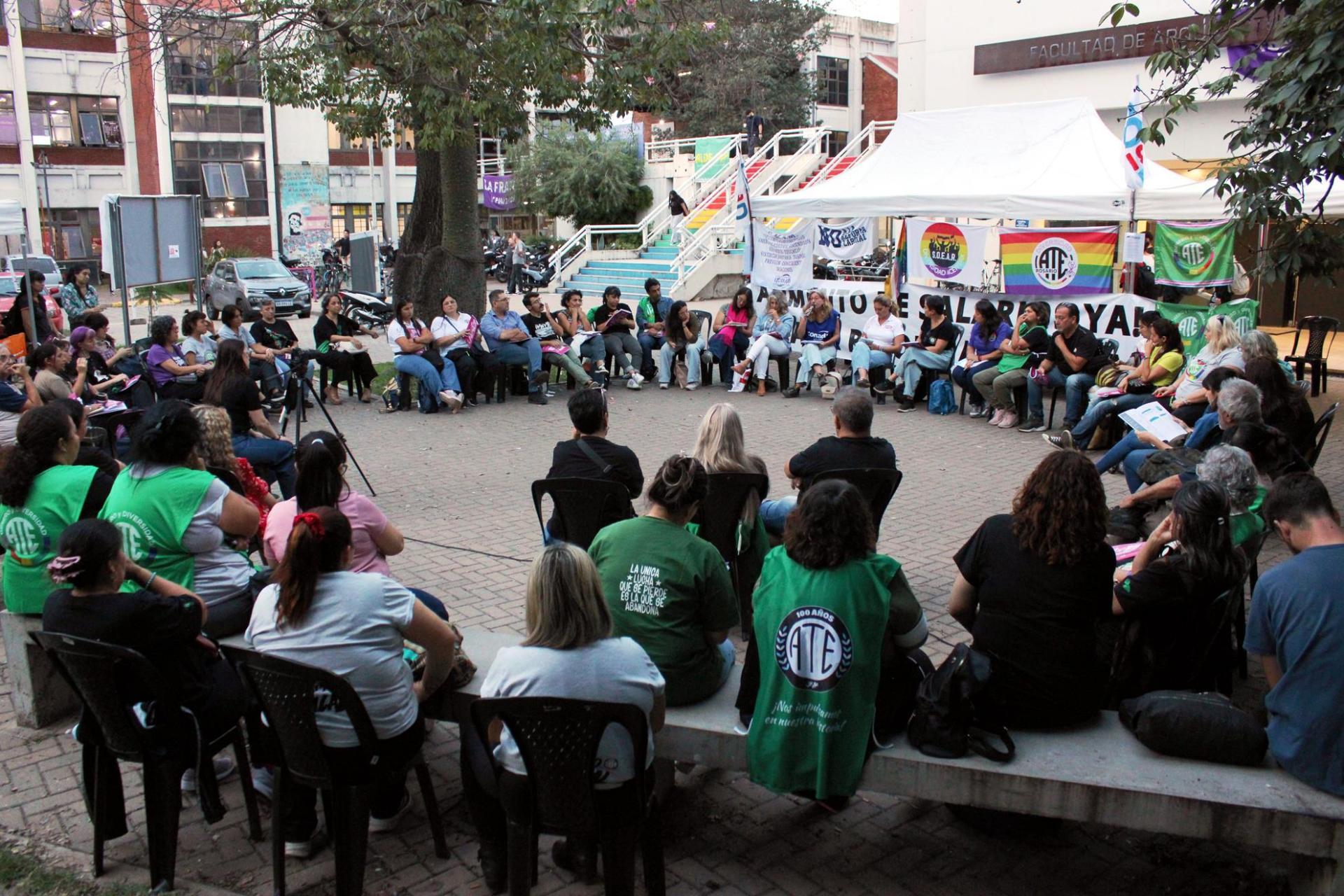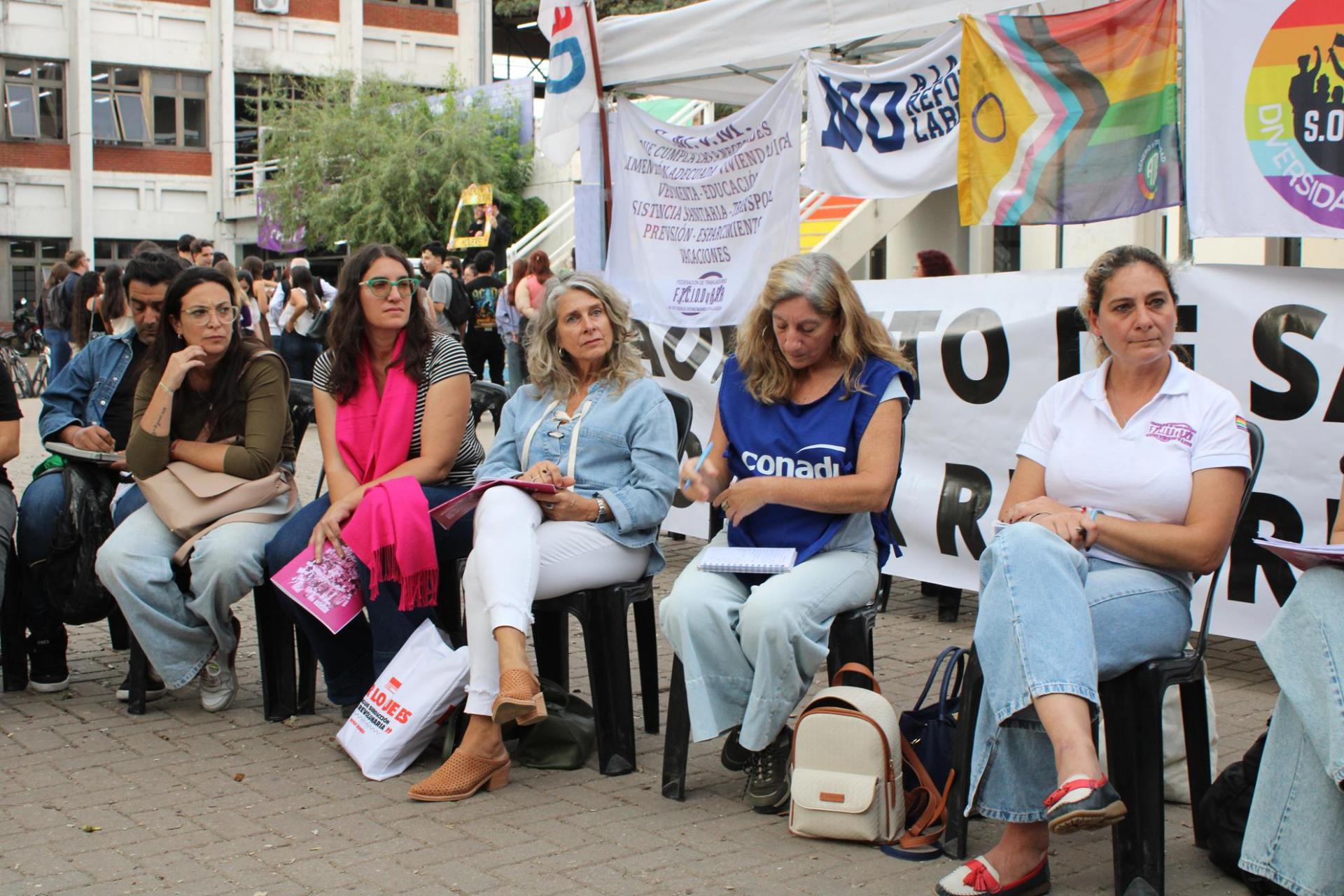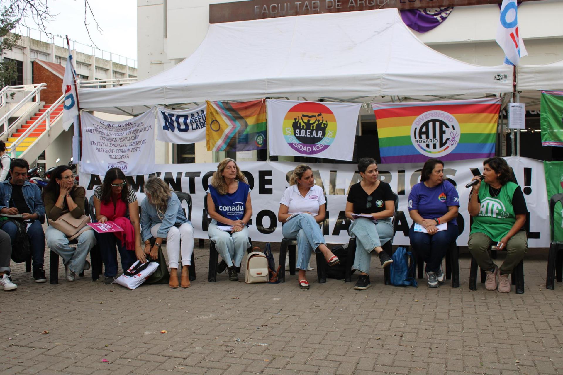 La actividad se realizó dentro del Centro Universitario de Rosario con fuerte participación sindical. Referentas gremiales cuestionaron el impacto regresivo de la reforma laboral y el atraso salarial. Convocaron a fortalecer la unidad para enfrentar las políticas del gobierno nacional y construir un pliego que contenga a todos los sectores.