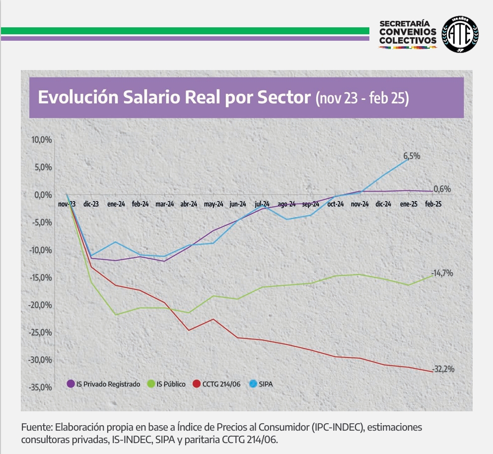 La Secretaría de Convenios Colectivos de ATE difundió un informe acerca de la situación salarial de la Administración Pública Nacional. Entre diciembre de 2023 y marzo 2025, el poder adquisitivo del sector se desplomó un 33,7%. Salarios de pobreza, 47 mil despidos y un ajuste que repercute en los derechos de la población.