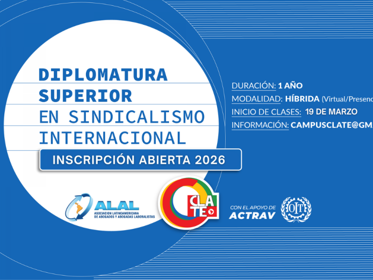 CLATE y ALAL con el apoyo de ACTRAV-OIT, convocan a dirigentes sindicales de organizaciones miembros a participar de su propuesta formativa anual y en la designación de aspirantes a cursar la cohorte 2026 de la Diplomatura Superior de Sindicalismo Internacional.