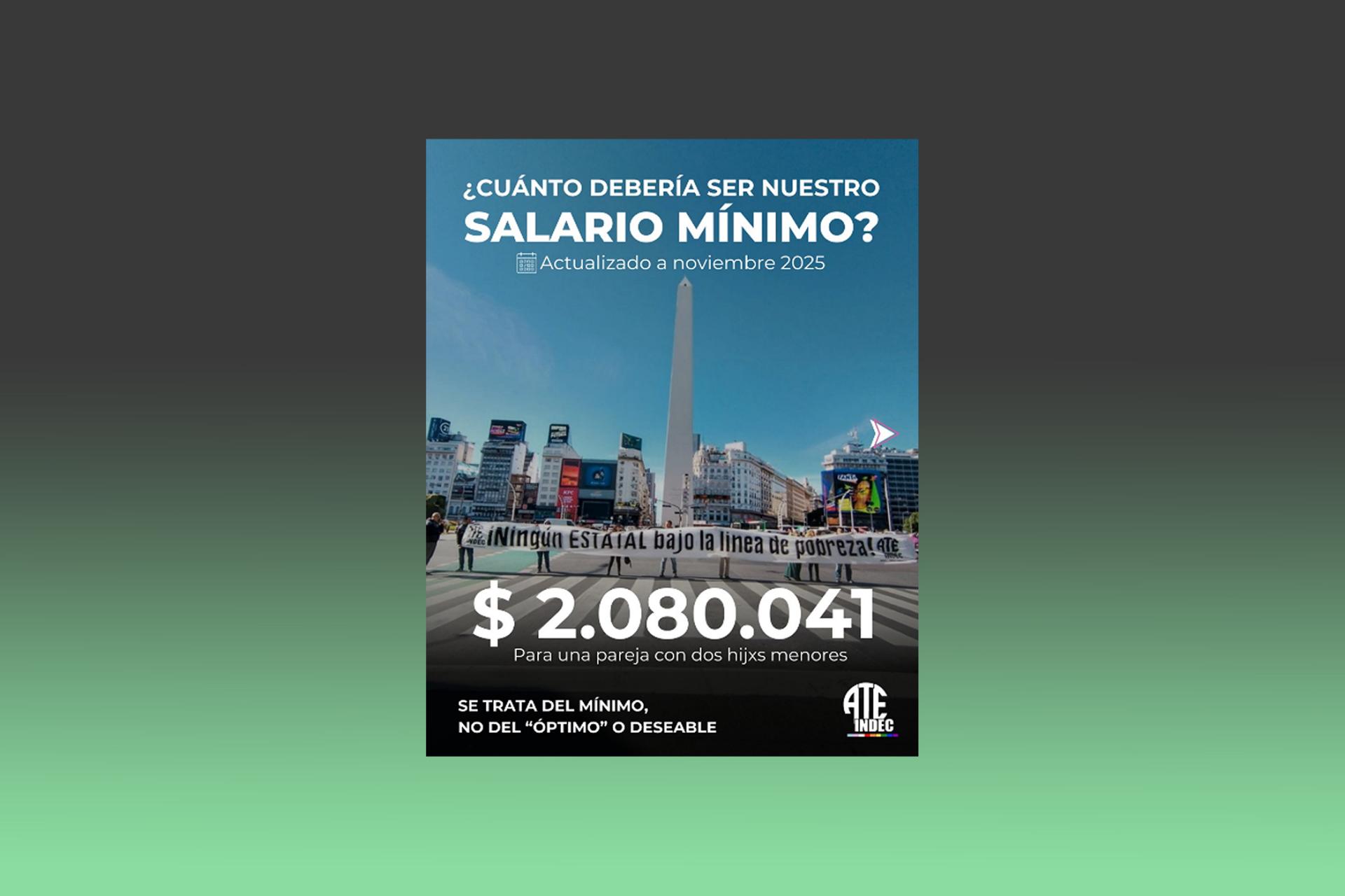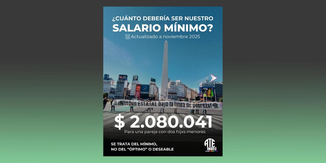 Un hogar formado por una pareja de 30 años con dos hijos en edad escolar necesitó en noviembre de 2025 un salario mínimo de $2.080.041 de bolsillo para cubrir las necesidades básicas. Así lo indica la nueva actualización del ejercicio ¿Cuál debería ser nuestro salario como mínimo?, elaborado en base a canastas de consumos mínimos que hacen trabajadores y trabajadoras de ATE INDEC.