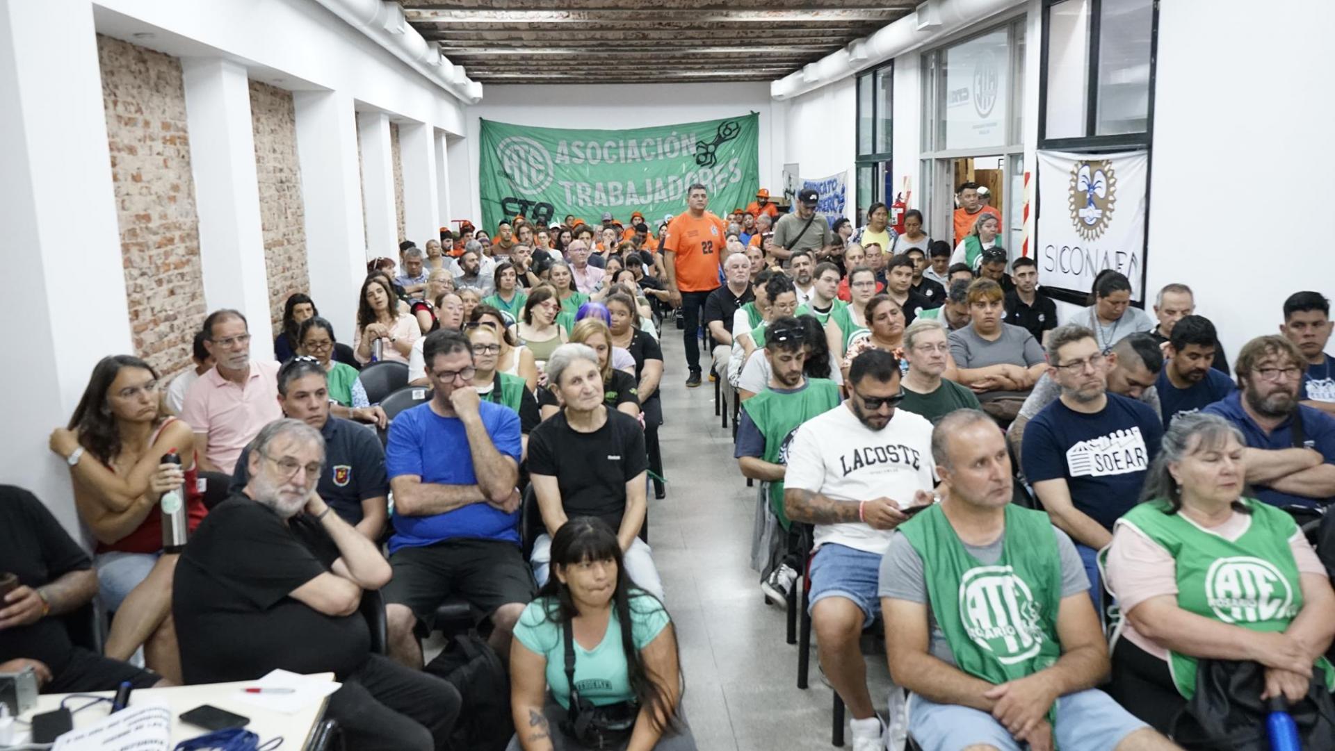Alrededor de 200 trabajadores y trabajadoras del ámbito público y privado se reunieron en ATE Rosario marcando un hito en la política gremial de unidad de acción. Se acordó un repudio activo a la llegada del presidente Javier Milei a la ciudad la semana próxima.