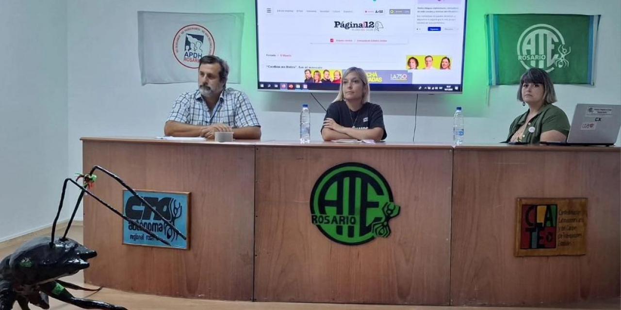 El panel estuvo compuesto por Marina Magnani - Integrante de la Mesa Directiva de APDH Rosario y asambleísta nacional APDH y José Giavedoni - Dr. C. Política UNR/CONICET y Consejero Asesor APDH Rosario. Fue moderado por Noelia Castañeda, Presidenta APDH Regional Rosario.